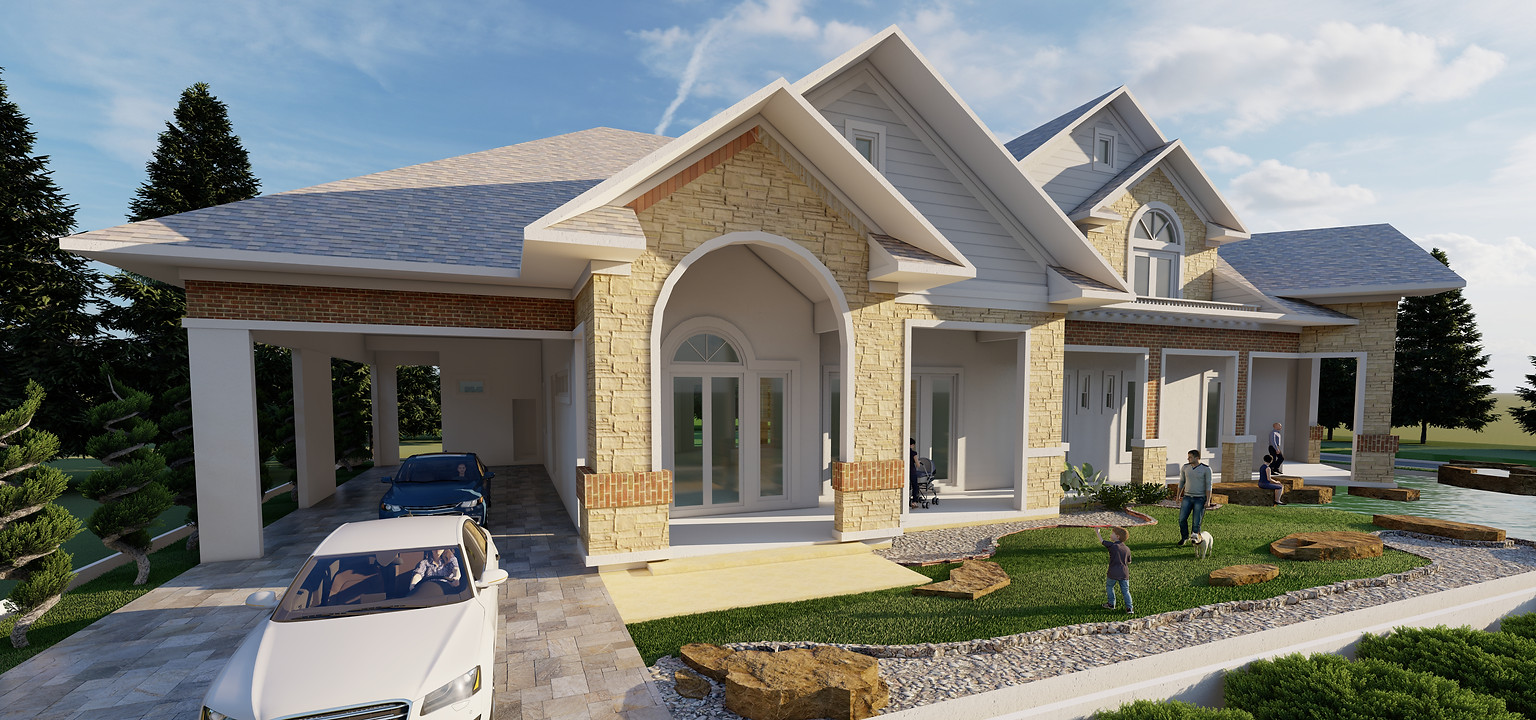 The exterior features a combination of stone and stucco, with a pitched roof and arched windows. A charming front porch provides a welcoming entrance. The house is surrounded by lush greenery, including trees, shrubs, and a landscaped front yard. A water feature adds a touch of serenity to the overall design. The house's architectural details and natural surroundings create a harmonious and inviting atmosphere